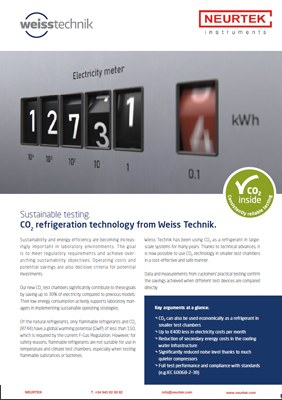Nuestra tecnología de refrigeración de CO2consume significativamente menos electricidad en nuestras cámaras climáticas y térmicas en comparación con tecnologías de refrigeración con R449A/R469A. Los equipos de ensayos no solo cumplen con todos los requisitos regulatorios, sino que también contribuyen de manera significativa a la reducción de costes y a la consecución de los objetivos de sostenibilidad.